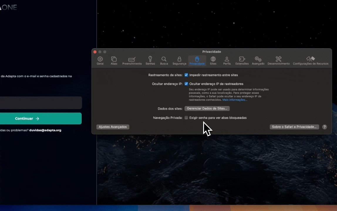 Vá em "Safari" > "Ajustes" > "Privacidade":